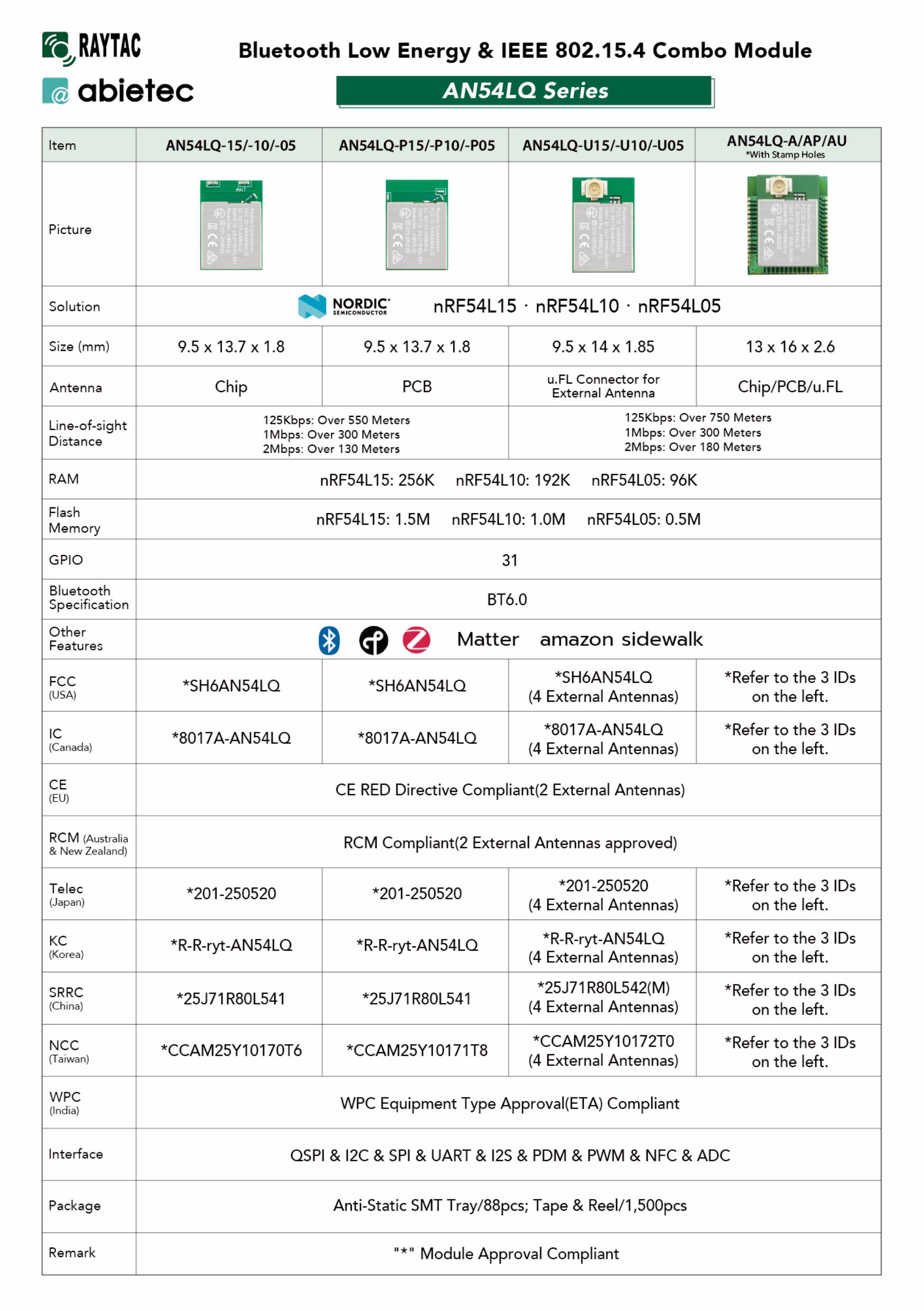 Raytac's nRF54L15 QFN module spectrum covers AN54LQ-15, AN54LQ-P15 and AN54LQ-U15 series with Chip Antenna, PCB Antenna and u.FL connector for External Antenna options for selection.
