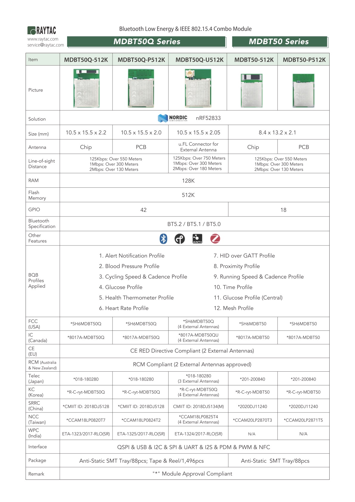 - Pre-Certifified Module: FCC/IC/CE/Telec/KC/SRRC/NCC/WPC certified & CE RED / RCM Compliant.